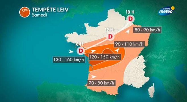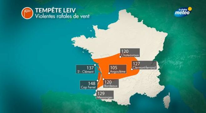 La tempête Leiv perd en intensité à mesure qu'elle progresse dans les terres. On relève encore 116 km/h à Clermont-Ferrand. Demain c'est au tour de la tempête Marcel, 8 départements du sud-ouest sont placés en vigilance orange vent et 2 en orange submersion.