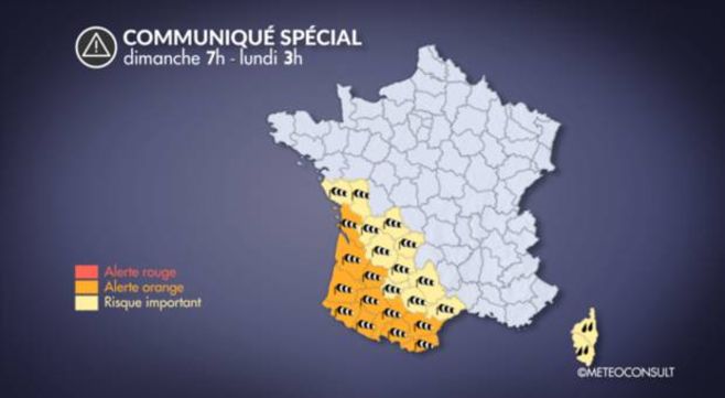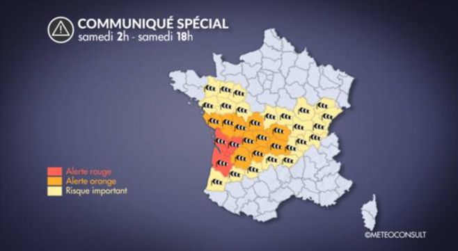 Dans l'actualisation du communiqué spécial de Météo Consult à 6h, les départements de la Gironde, de la Charente-Maritime et de la Charente sont maintenus en alerte rouge jusqu'à 10h. 9 autres départements du centre-ouest sont, quant à eux, en alerte de niveau orange.