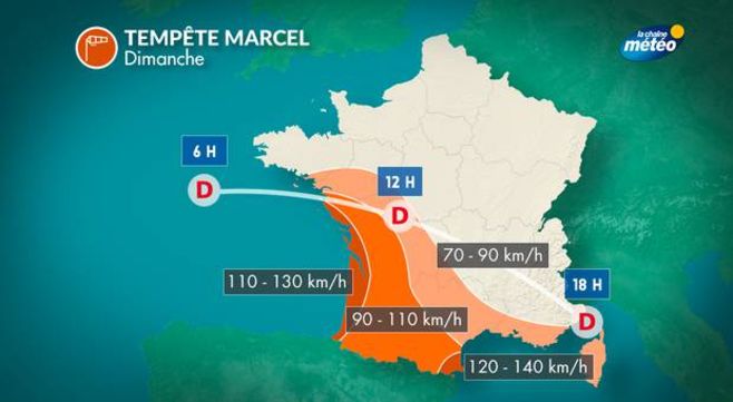 Après Kurt et Leiv, la tempête Marcel s'approche des côtes de l'ouest avec son centre positionné au large immédiat de la Pointe du Raz (29). Les vents de secteur ouest se renforcent nettement sur le littoral atlantique avec des rafales atteignant 117 km/h à Pornichet (44), 115 km/h au Cap Ferret (33), 113 km/h à Belle-Île (56) alors que dans les terres, les valeurs sont généralement comprises entre 60 et 70 km/h. Elles accompagnent une forte instabilité dans le sud-ouest avec déjà quelques orages observés en Aquitaine.