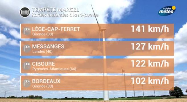 Direct #tempête #Marcel 13h21 : les #vents dépassent maintenant les 130 km/h sur le littoral d'#Aquitaine et jusqu'à 90 km/h à #Bordeaux pic.twitter.com/wwRMIfAasl