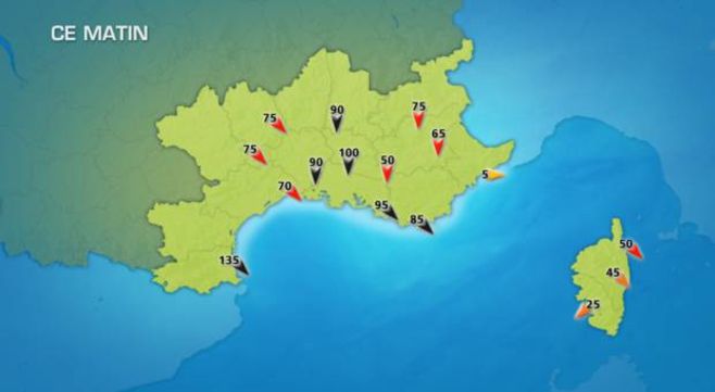 Attention également aux fortes rafales dans le domaine du mistral. Même si elles seront nettement moins violentes que dans le Roussillon, elles pourront souffler jusqu'à 100 voire 110 km/h au cours de cette journée. 6 départements de la basse vallée du Rhône ont ainsi été placés en alerte jaune par les services de Météo Consult.