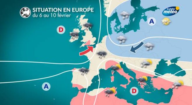 A partir de jeudi, le nord de la France passera sous l'influence d'un anticyclone présent sur la Scandinavie. Le temps deviendra plus sec, sauf sur les régions du sud où il sera beaucoup plus perturbé avec de la neige sur les Pyrénées et les Alpes. Il fera plus froid. Les fortes gelées se généraliseront dans l'Est, jusqu'à -7°C dans les plaines et vallées d'Alsace et de Lorraine. L'après-midi, on n'attend pas plus de 2°C en Alsace à 10°C en Aquitaine et jusqu'à 13°C près de la Méditerranée.