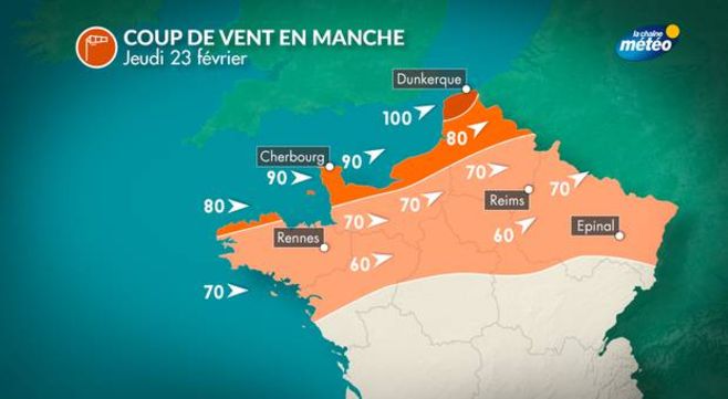 Sur les côtes bretonnes et normandes, les rafales de vent atteindront 80 km/h sur les côtes exposées. Dans les terres on attend des rafales de 60 à 80 km/h du pays nantais aux frontières du nord en passant par l'Ile-de-France.