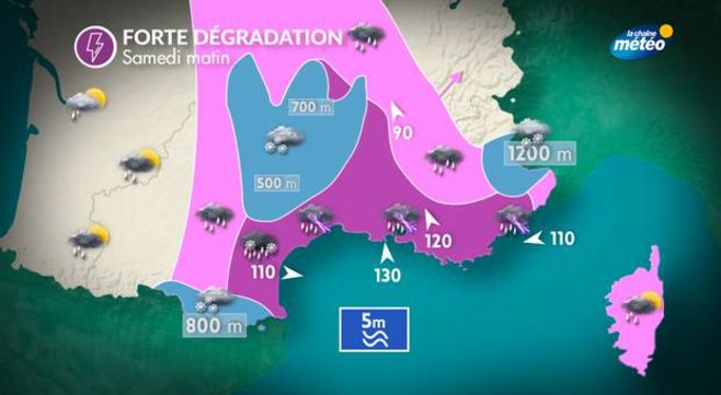 Ce samedi, les conditions météo sont très perturbées ce matin du Massif-Central aux Alpes et à la Méditerranée avec de fortes pluies à caractère orageux et des vents violents qui atteignent 100 à 120 km/h de la Provence à la moyenne vallée du Rhône. La neige tombe dès 500 m sur le Massif-Central, 1000 m sur les Alpes. Dans l'après-midi, le temps devient moins agité avec le retour de quelques éclaircies près de la Méditerranée et des vents moins forts. La neige continue de tomber à basse altitude sur les reliefs. Dans le sud-ouest le temps est très instable avec éclaircies et averses s'accompagnant parfois de grêle et de violentes rafales de vent. Au nord, des pluies se produisent une bonne partie de la journée du Bassin parisien aux Hauts-de-France. Dans le nord-ouest, le ciel est changeant avec éclaircies et passages nuageux pouvant s'accompagner d'une ondée. Sur le nord-est, après un temps sec en matinée, des pluies éparses sont attendues cet après-midi.