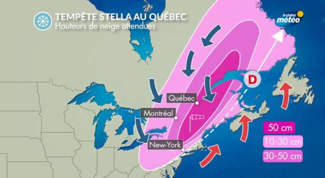 La tempête de neige Stella remonte vers le nord-est, c'est à dire en direction des provinces Maritimes du Québec. A son passage, les chutes de neige et le vent violent vont se renforcer sur le sud du Québec, notamment en Montérégie et en Estrie : plus de 50 à 60 cm de neige sont attendus. Cette tempête de neige pourrait figurer parmi les plus fortes subies par le Québec en mars. Le fleuve Saint Laurent marque la limite de cette tempête de neige : ainsi, les quantités attendues à Montréal devraient rester nettement plus modérées.