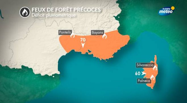 C'est normalement à la fin de l'hiver et au début du printemps que les pluies sont les plus intenses dans le sud-est de la France. Or depuis le 10 février dernier, les pluies se font rares. Le déficit pluviométrique atteint 70 à 80 % en Corse et en Provence. Les sols deviennent secs.