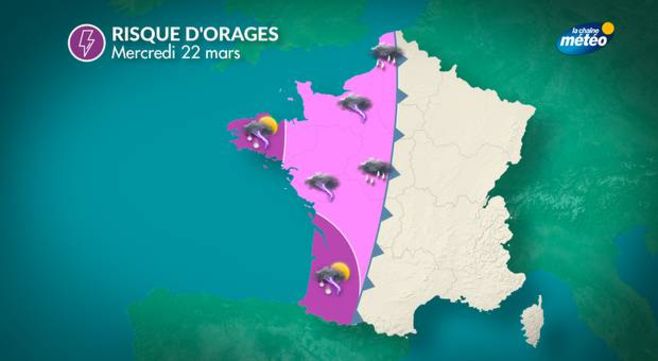 Ce mercredi signera l'arrivée des orages sur l'ouest : un front froid va traverser lentement la moitié du pays. Un ciel de traîne s'établira en journée sur les régions de l'arc Atlantique avec des giboulées, averses et orages localement assez forts. Localement, les cumuls pluviométriques pourront avoisiner les 20 à 25 mm, de façon disparate et parfois brutale. Le vent de sud-ouest soufflera en bonnes rafales, jusqu'à 70 à 80 km/h.