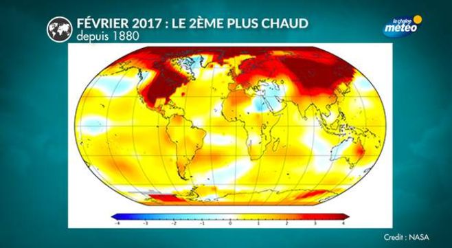 Indiquons aussi que le mois de février écoulé fut le 2ème le plus chaud enregistré au niveau planétaire depuis le début des relevés, avec +1,1°C au-dessus des moyennes (les chiffres officiels sont compris entre une anomalie de +0.9°C et +1,1C°). Seules quelques anomalies froides vers la mer du Labrador ainsi qu'au Moyen Orient (Pays du Golfe) ont été observées.
