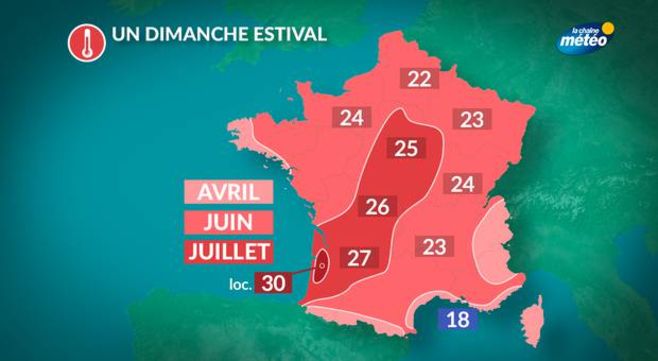 S'il n'y a presque rien à signaler côté ciel, ce sont les températures qui font l'actualité. Malgré la fraîcheur du tout début de journée notamment au nord de la Seine, les températures affichent déjà des valeurs supérieures à 10°C sur les rivages de l'Atlantique et de la Méditerranée le matin. Rapidement, les températures grimpent avec des maximales quasiment partout supérieures à 20°C. La barre des 25°C sera atteinte de l'Anjou à la Beauce en descendant vers le piémont pyrénéen. Le mercure culminera à 28°C entre Dax et Bordeaux. Cette journée de dimanche sera donc estivale, avec des températures dignes d'une mi-juin, voire d'un début de mois de juillet. Seuls les bords de la Méditerranée seront à l'écart de ce temps chaud en raison de la brise marine. Entre Leucate et Menton, les maximales auront parfois du mal à atteindre 18°C.