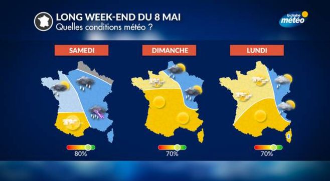 Pour votre week-end prolongé du samedi 6 au lundi 8 mai, le temps s’annonce tout d'abord perturbé, avant une amélioration en seconde partie de week-end. Les températures seront contrastées entre le nord et le sud.