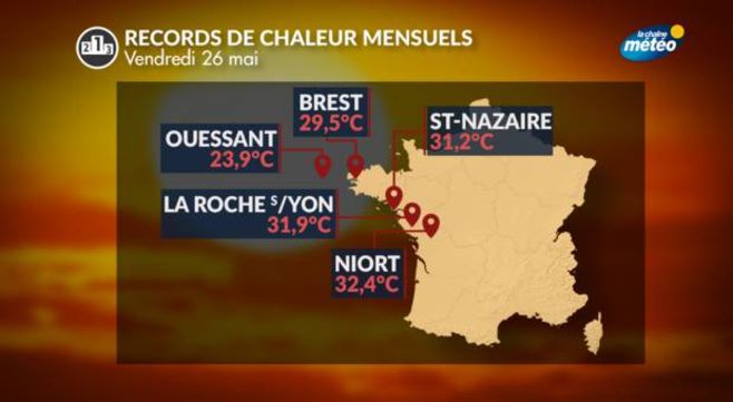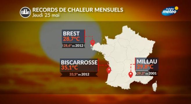 Le premier record a été enregistré jeudi après-midi à Biscarrosse (40) avec jusqu'à 35,1°C sous abri (ancien record : 33,5°C le 26 mai 2005). Millau (12) a également battu son record mensuel avec 29,8°C (ancien record : 29,2°C le 30 mai 2001) tandis qu'avec 28,7°C, il n'avait jamais fait aussi chaud au cours d'un mois de mai à Brest (29) (ancien record : 28,6°C le 25 mai 2012).