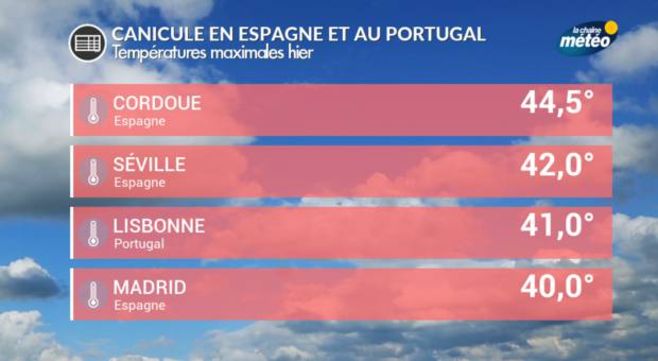 Après une semaine éprouvante où il a fait très chaud avec 39,9° à Madrid (ce qui constitue un record de chaleur pour un mois de juin) et 44,5°C à Cordou ce samedi, la chaleur caniculaire persiste toute la semaine. Les maximales atteindront encore les 40 à 44°C entre la province de Murcie, l'Extrémadure, l'Andalousie et le sud de la Mancha. Plus que les valeurs absolues, c'est la persistance de ces fortes chaleurs extrêmes qui devient exceptionnel avec des températures voisines de 40°C jusqu'au prochain week-end. L'intérieur du Portugal et l'Algarve subissent aussi ces fortes chaleurs : même le littoral portugais est concerné avec des pointes à 41°C enregistrées à Lisbonne. Cette situation de blocage anticyclonique est installée depuis dimanche 11 juin et se maintiendra jusqu'au week-end des samedi 24 et dimanche 25 juin inclus.