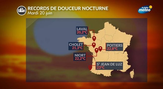 Les premiers records mensuels ont été enregistrés dans la nuit de lundi à mardi. Les températures ne se sont pas abaissées en dessous de 20,2°C à Laval (ancien record : 19,4°C le 28 juin 2012) ; 21,3°C à Cholet (ancien record : 21,1°C le 27 juin 2005) ; 22,2°C à Niort (ancien record : 21,1°C le 28 juin 2005) ; 22,8°C à Poitiers (ancien record : 22,3°C le 28 juin 2005) ou encore 23°C à Saint-Jean-de-Luz (ancien record : 21,8°C le 09 juin 1928).