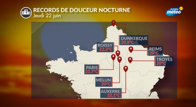 La nuit suivante a été de nouveau tropicale et des records parfois vieux de 80 ans sont tombés. On a notamment relevé 20°C à Melun (ancien record : 19,9°C le 25 juin 2008) ; 22,3°C à Roissy (ancien record : 22°C le 29 juin 1976) ; 20°C à Reims (ancien record : 19,2°C le 18 juin 2002) et Troyes (ancien record : 19,5°C le 19 juin 2013) ou encore 22,1°C à Auxerre (ancien record : 21,8°C le 28 juin 2011).
