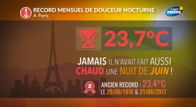 A Paris, la température ne s'est pas abaissée en-dessous de 23,7°C. C'est ainsi un nouveau record pour un mois de juin, dépassant le précédent qui avait été établi le 29 juin 1976 avec 23,4°C.