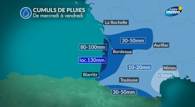 Dans le sud-ouest, c'est un temps très agité qui domine avec de très fortes averses orageuses toute la journée. Le vent souffle à 90 km/h en rafales sur le littoral aquitain.