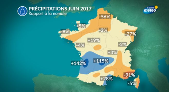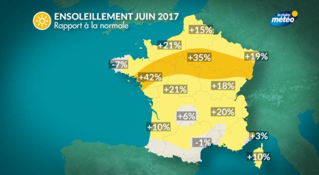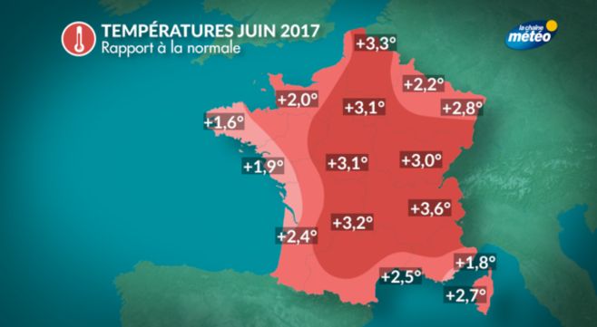Le mois de juin 2017 a été particulièrement chaud avec un excédent de températures de 2,7°C, le plaçant au 2ème rang des mois de juin les plus chauds depuis 1900,loin derrière juin 2003 puisqu'on y avait observé plus de 4°C d'excédent. Les précipitations sont proches de la normales même s'il on observe de grandes disparités régionales en raison des orages. Enfin l'ensoleillement a été généreux avec un excédent de 13% par rapport à la normale.