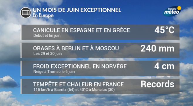 Depuis le début du mois de juin, l’Europe est coupée en deux : la péninsule ibérique a vécu une canicule historique avec 40°C mesurés à Madrid alors que le froid s’est maintenu des pays baltes à la Finlande. Le 20 juin, il a neigé à Mourmansk en Russie. En France, ce mois de juin a été très contrasté avec un fort coup de vent le 6 juin près de la Manche, suivi d’une vague de chaleur très précoce à laquelle a succédé de fortes pluies cette dernière semaine.
