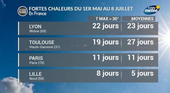 Depuis le 1er mai dernier, Paris compte 11 journées où les températures maximales ont dépassé 30°C. Or chaque année, seuls 11 jours permettent aux températures de dépasser 30°C. A Lille, le nombre de jours par an où la température dépasse 30°C est de 5. Au 8 juillet 2017, le nombre de jours où la température a dépassé 30°C à Lille est déjà de 8. Enfin à Lyon, on compte 22 jours où les maximales ont déjà dépassé 30°C contre 23 jours en moyenne sur un an.