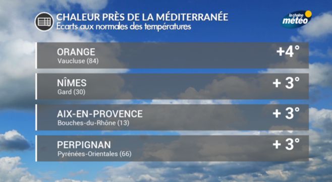 Les régions méditerranéennes sont également affectées par la sécheresse. Les températures y sont très élevées depuis le début de l’été, supérieures de 3 à 4°C aux normales. Le Mistral et la Tramontane soufflent quotidiennement depuis le 15 juin à plus de 50 km/h. Ces vents agissent comme le foehn de Pyrénées. En passant au-dessus des Alpes, des Pyrénées et des Cévennes, Mistral et Tramontane accentuent la sécheresse de l’air sur les plaines littorales. Ainsi, l’humidité très basse et les fortes chaleurs sont la cause des nombreux incendies et feux de forêt en cours.