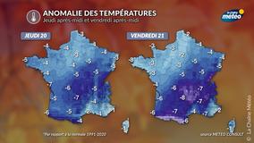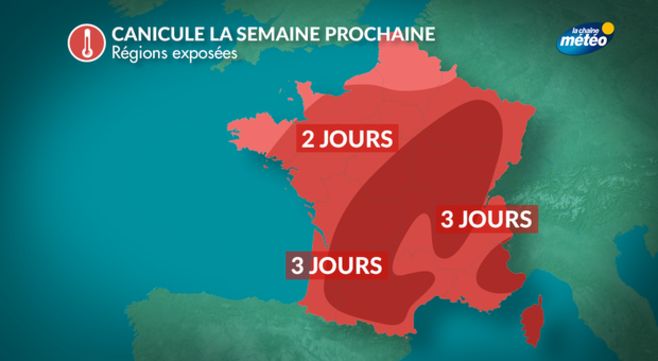 Durant cet épisode de très fortes chaleurs, les températures maximales atteindront de 33 à 35°C entre Paris, Rennes et Strasbourg et jusqu’à 37°C dans entre le piémont pyrénéen, l'intérieur de la Nouvelle-Aquitaine, les vallées d’Auvergne en remontant vers le Val-de-Loire. Les nuits seront lourdes avec des minimales qui descendront difficilement sous la barre des 16 à 20°C, notamment dans les grandes agglomérations.
