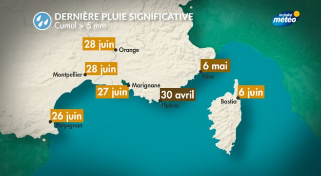 Le Var, les Alpes-Maritimes et la Corse sont les plus touchés avec des cumuls de précpitations particulièrement faibles depuis le début du mois de mai et un déficit pluviométrique de l'ordre de 70 à 90%. En basse vallée du Rhône, le déficit de pluie est de l'ordre de 50 à 60% tandis qu'il n'excède pas 30% en Languedoc-Roussillon où les épisodes pluvio-orageux ont été un peu plus nombreux.