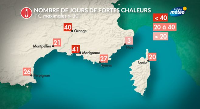 Les fortes chaleurs se sont installées dès le début du mois de juin sur l'arrière-pays méditerranéen. On dénombre une quarantaine de jours où la température a dépassé le seuil de 30°C entre le Vaucluse et l'arrière-pays provençal, environ 30 jours sur la plaine du Roussillon ou le littoral varois. La côte d'azur et le littoral de la Corse ont connu des épsiodes de fortes chaleurs moins fréquents car les brises de mer ont souvent limité la hausse des températures.