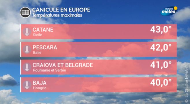 Depuis début août, une canicule frappe l'Italie, les Balkans et l'Europe centrale. En Roumanie, Bulgarie et Italie, cette canicule durera encore une partie de la semaine prochaine. Des records de chaleurs absolus sont attendus. Le sud-est de la France subit aussi des températures record, notamment du sud de Rhône-Alpes à la Provence.