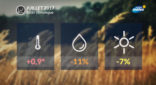 Après un mois de juin particulièrement chaud avec un excédent de 2,7°C, le mois de juillet a été plus modéré avec une alternance de périodes chaudes et ensoleillées et de périodes plus fraîches et nuageuses. Quelques dégradations pluvio-orageuses ont affecté le pays et plus particulièrement les régions situées du centre et de l'Ile-de-France au nord-est. Les régions méditerranéennes sont restées à l'écart des zones perturbées avec un temps sec tout au long du mois.