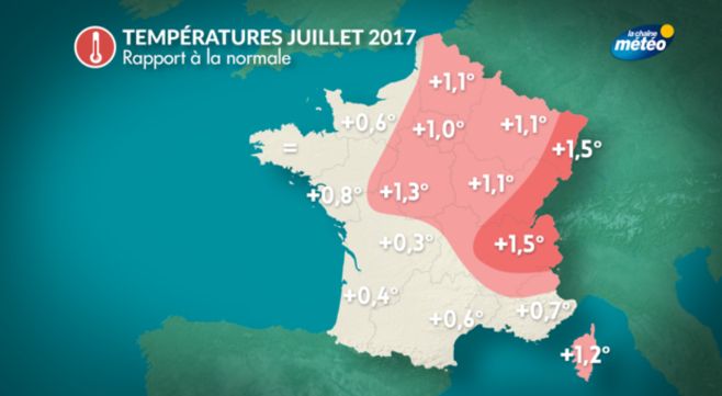 Les températures de ce mois de juillet 2017 moyennées sur la France présentent un excédent de 0,9°C par rapport à la normale 1981-2010. On retiendra le pic de chaleur des 18 et 19 juillet avec jusqu'à 38° dans le sud-ouest et des records de chaleur nocturne la nuit suivante. A noter aussi le début d'un épisode de canicule sur l'extrême sud-est le 31 juillet avec 40,6° à Carpentras.