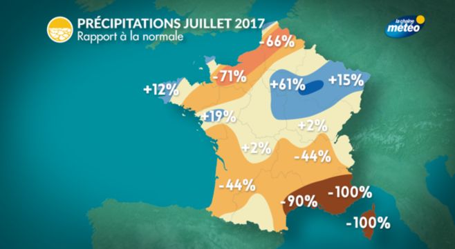 Des orages parfois violents ont circulé du centre et du Bassin parisien au nord-est. A Paris, un record d'intensité pluviométrique a été battu sous un orage le 9 juillet avec 47 mm en une heure. Les régions situées du sud de la Bretagne et de la Normandie aux Hauts de France ont le plus souvent échappé à ces dégradations orageuses avec un déficit de pluie de l'ordre de 30 à 60%. Les régions méditerranéennes sont restées à l'écart des précipitations tout au long du mois.