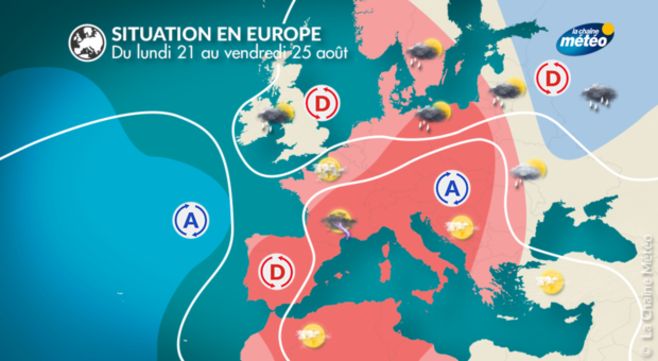 Le temps deviendra plus instable à partir de jeudi avec des orages attendus des Pyrénées aux frontières de l'est. Les régions méditerranéennes resteront à l'écart avec le maintien de très belles éclaircies tandis que le ciel sera variable dans le nord-ouest, sans risque d'averse. Vendredi, l'axe orageux se maintiendra du sud-ouest au nord-est tandis qu'une perturbation pluvieuse venue de l'Atlantique abordera la Bretagne et le Cotentin.