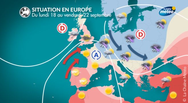 La dépression responsable du mauvais temps remontera vers la Scandinavie, repoussée par l'anticyclone des Açores. En raison de l'humidité laissée par les averses, les nuages bas et les brouillards seront fréquents le matin.