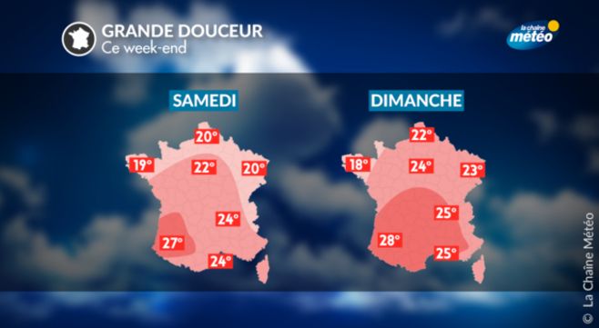 Le matin il fait encore très frais avec 5 à 10°C au lever du jour. Cet après-midi, on attend de 19°C à 23°C au nord et de 22 à 27°C au sud. Demain, il fera particulièrement doux avec 20 à 26°C au nord et de 26 à 29°C au sud, jusqu'à 30°C entre Bordeaux et Toulouse. D’une manière plus générale l’amplitude des températures sera très importante entre le lever du jour et le milieu d’après-midi.