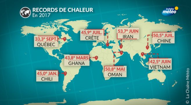 Sur les 9 premiers mois de l’année 2017, plus de nombreux records de chaleur nationaux ont été battus à travers le monde. On retiendra notamment les 45°C relevé au Chili en janvier dernier, 45,9°C en juillet en Crête, 50,5°C en Chine et jusqu'à 53,7°C en Iran.