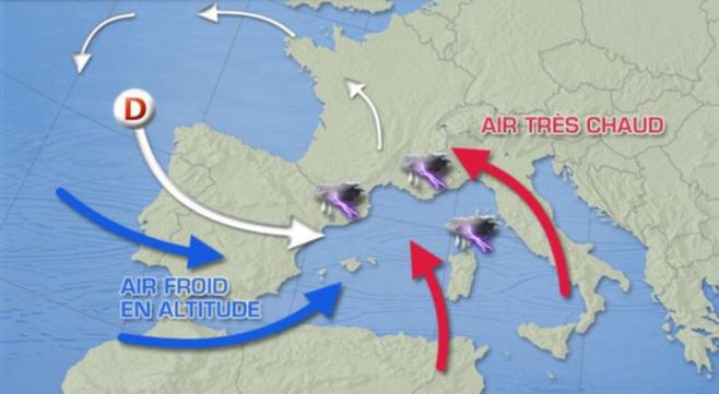 Chaque année, à la fin de l’été, les eaux de la Méditerranée sont au plus chaud (souvent entre 24°C et 27°C). Dans le même temps, les premières descentes d’air frais en provenance du nord de l’Europe se produisent : ce contexte général entraîne une intense évaporation et un conflit de masses d’air, propices à la formation d’orages souvent stationnaires. Lorsque de surcroit, le vent marin remonte vers la France et ses reliefs, il force l’air à s’élever et à se refroidir et entraîne une forte condensation. Ce principe est fréquent sur les Cévennes (d’où le terme souvent utilisé d’épisode cévenol) mais il se produit de manière générale sur toutes les montagnes qui surplombent la Méditerranée comme les Pyrénées-Orientales, les Alpes du Sud, les Cévennes…On retrouve les mêmes causes et les mêmes effets sur les côtes espagnoles et italiennes.