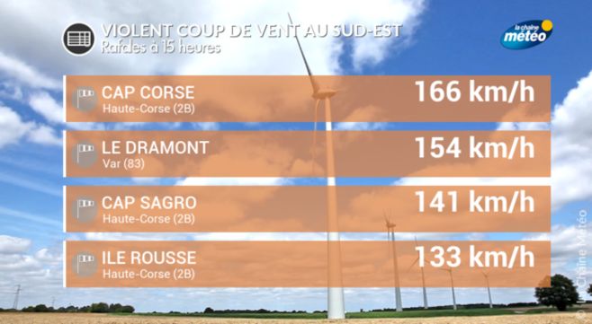 Enfin près de la Méditerranée, le soleil brille facilement avec du mistral et de la tramontane qui soufflent à 100 km/h en pointe sur les caps et côtes exposés du Var et des Pyrénées-Orientales. En Corse, le vent souffle à 130 km/h sur Balagne et le cap Corse où le ciel est nuageux avec un risque d'averses jusqu'en milieu d'après-midi.
