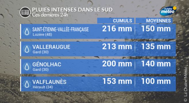 Cet épisode méditerranéen est le premier de l'automne. Il a donné lieu à de fortes pluies orageuses du Languedoc à la Provence côte d'Azur. Entre 200 et 220 mm de pluies ont été recueillis hier sur les Cévennes, ce qui correspond à 1 mois et demi de précipitations. De grandes villes méditerranéennes ont également été touchées. A Montélimar, Istres, Arles et Marignane, il est tombé entre 40 et 80 mm de pluies, soit 15 jours de précipitations en l'espace d'une journée.