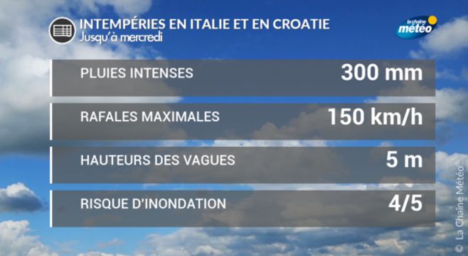 Cette dépression frappe entre lundi soir et mercredi une partie des Balkans, la Croatie et la Slovénie surtout. Sur ces pays les cumuls de pluies pourront atteindre entre 150 et 300 mm en 48 heures, faisant craindre des débordements et des inondations. Sur la côte dalmate, la vent du Nord-est (appelé Bora ) se lèvera lundi et atteindra les 100 km/h. Ponctuellement, dans les zones les plus exposées, des pointes à 160 km/h sont même possibles sur le secteur de Zadar.