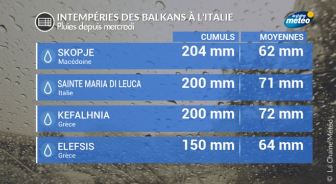 Depuis mercredi, les inondations très fortes se produisent au sud de la Grèce, en Macédoine, ainsi que dans les Abruzzes en Italie. Le bilan humain est lourd (une quinzaine de victimes).
