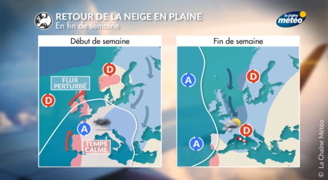 Après un début de semaine calme et anticyclonique, mais souvent gris, la situation météo va radicalement changer en deuxième partie de semaine. Dès vendredi, un flux de nord-ouest froid et humide va se mettre en place avec des giboulées de neige possibles jusqu'en plaine.