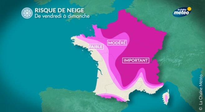 Samedi, le temps froid et humide persistera avec des giboulées au nord et à l'est. On surveillera ensuite une perturbation océanique qui traversera la France d'ouest en est, entre samedi soir et dimanche, et qui pourrait apporter un épisolde de neige significatif de la Normandie, au Bassin parisien mais aussi au nord-est. La situation manque encore de fiabilité à cette échéance car la trajectoire de la perturbation est encore susceptible d'évoluer. Nous vous tiendrons informer de l'évolution de cette situation à risque de neige en plaine.