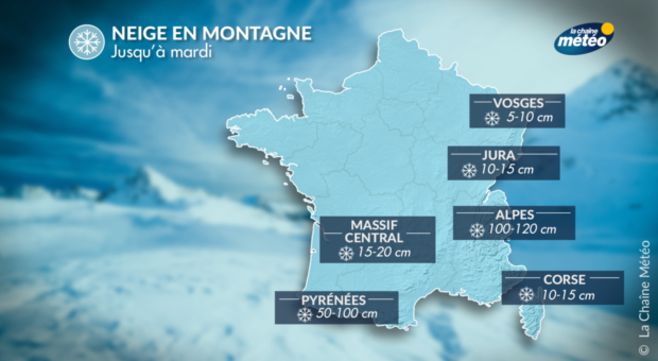 Ce lundi, le vent souffle en tempête sur tous les massifs. Cette tempête précède l'arrivée d'abondantes chutes de neige sur les Pyrénées aujourd'hui avec une limite pluie / neige qui redescend à 800 mètres en fin de matinée. Sur le Massif-Central, les Alpes, le Jura et les Vosges, la limite pluie / neige encore élevée ce matin descend à 1000 mètres en soirée au moment du passage de la perturbation. D'ici mardi, on attend 20 à 40 cm de neige à 1500 mètres d'altitude et encore 50 à 80 au-dessus de 1800 mètres.