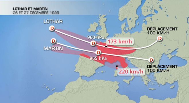 Dans la nuit du 25 au 26 décembre 1999 et la matinée du 26, une tempête exceptionnelle a balayé le nord de la France. Prénommée "Lothar", cette tempête est due à la conjonction d'un puissant jet stream en altitude (400 km/h à 8000 mètres d'altitude) et d'une profonde dépression en surface (960 hPa). Ces deux phénomènes sont entrés en interaction (on parle de "phasage" entre le Jet Stream et la dépression de surface). Elle s’est formée au large de Terre-Neuve avant de traverser l’Atlantique en moins de 24 heures. Elle a dévasté, dans la journée du 26 décembre 1999, le nord de la France, la Suisse, l'Allemagne et le Danemark, causant des dommages sans précédent avec des vents jusqu'à 259 km/h. La forte tempête liée à cette très profonde dépression a touché la Bretagne à environ 2 h du matin et quitté notre territoire par l'Alsace à 11 heures ; elle s'est donc déplacée à plus de 100 km/h.
