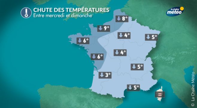 Après la douceur de la semaine, les températures baissent notablement. On attend de 4 à 8°C l'après-midi sur une moitié nord-ouest du pays. Ailleurs, elles seront comprises entre 8 et 12°, jusqu'à 15° en Corse.