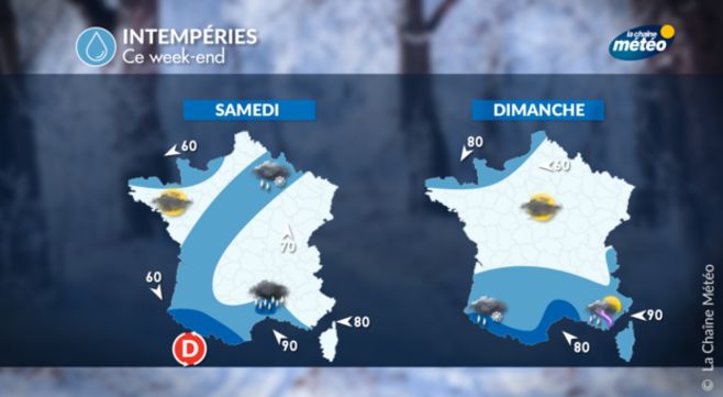 Samedi, une perturbation apporte nuages et pluies du sud-ouest au nord-est en passant par le Centre-Val-de-Loire. Sur les Pyrénées, la neige tombe abondamment dès 1000 à 1200 m d'altitude. Dans le sud-est, le temps se dégrade avec des pluies de plus en plus soutenues sur les Cévennes et quelques averses entre le Languedoc et la côte d'azur. Au nord-ouest ainsi que de l'Alsace au nord des Alpes, les conditions sont plus calmes avec un temps généralement sec et des éclaircies.