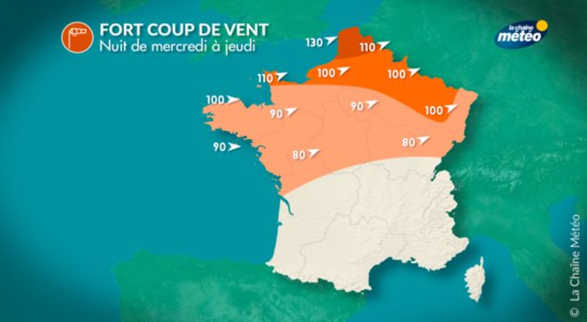 Les départements du Nord et du Pas-de-Calais sont en alerte orange pour vents violents. Le vent souffle fort également des côtes de la Manche à la Belgique. Sur les côtes exposées de la Manche, le vent de sud-ouest souffle violemment avec des rafales maximales de 100 à 110 km/h et jusqu'à 130 km/h sur le Boulonnais et le détroit du Pas-de-Calais. Dans les terres, c'est sur les Hauts-de-France, que le vent est le plus violent avec des rafales de 100 à 110 km/h. De la Bretagne au nord-est en passant par l'Ile-de-France, les rafales atteignent 80 à 100 km/h.
