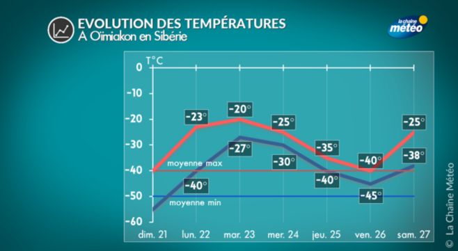 Pour les prochains jours, la neige est attendue avec un net redoux (la notion de redoux étant relative avec -25°C alors que la moyenne est de -40°C à Oïmiakon). Les nuits seront donc moins glaciales et les températures remonteront un peu avec une moyenne de -35°C le matin et -25°C la journée avant une nouvelle chute des températures en fin de semaine