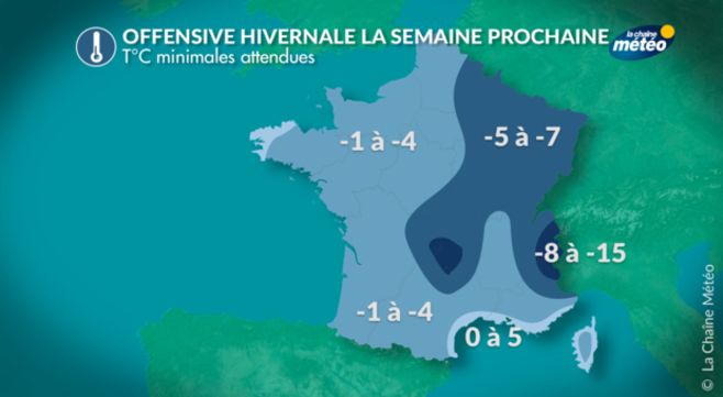 Avec l'arrivée de masses d'air beaucoup plus froides et d'un ciel plus dégagé pendant les nuits, les gelées vont se généraliser. Il fera ainsi de -1 à -4°C sur l'ouest et le sud, et de -5 à -8°C possible en plaine du centre au nord-est entre mardi et jeudi. Seul le littoral méditerranéen et la pointe bretonne devraient échapper aux fortes gelées. Les après-midi, les températures seront généralement comprises entre 0 et 3°C au nord-est et de 4 à 10°C sur le reste du pays.