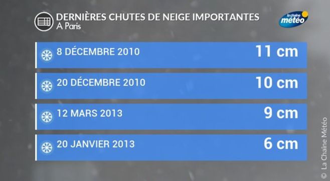 Avec 12 cm de neige au sol mesurés dans Paris, la chute de neige du 7 février dernier est l'une des plus importantes qu'a connue la capitale depuis 1945. Elle est d'autant plus surprenante qu'elle s'est produite au milieu d'un hiver relativement clément, ce qui n'a pas été le cas lors des chutes de neige de décembre 2010 et janvier 1987.